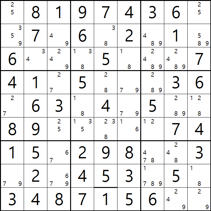 머리속으로는 이렇게 보면 된다, 287 (좋아), 267 (좋아), 678(좋아), 크로스 되는 숫자는? 8이구만~ 지워! 지워!