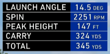 14.5도의 출발각일 때는 백스핀이 2251RPM으로 줄어 들었음에도 비거리 345야드에 최고 높이 147피트인 것을 알 수 있다.