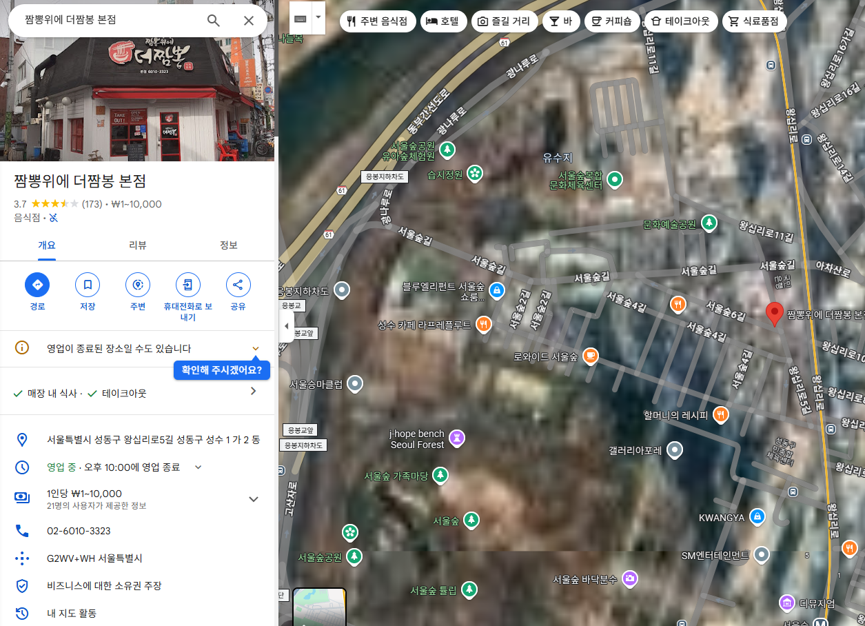 하아~ 아쉽게도 여기 별점은 구글은 테러 수준이다... 3.7점이고 네이버는 4.25점인데... 개인적으로는 볶음밥은 4.5점 줘도 아깝지 않고, 짬뽕은 4.1 정도다... 서울숲 들렀다가 뭐 먹을지 고민되거나 웨이팅 긴 곳을 피하고 싶다면 여기다~