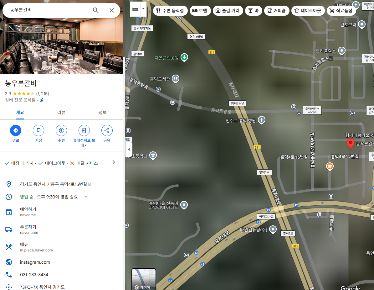 태광CC 입구에 있는 갈비집인데... 본수원 왕갈비 갈 시간 아낄 때 가는 고기집으로 무난히 맛있다. 구글 점수는 3.9점이고 네이버는 4.29점인데 구글은 좀 박하고 네이버와 같은 4.3점은 줘도 되는 곳이다.