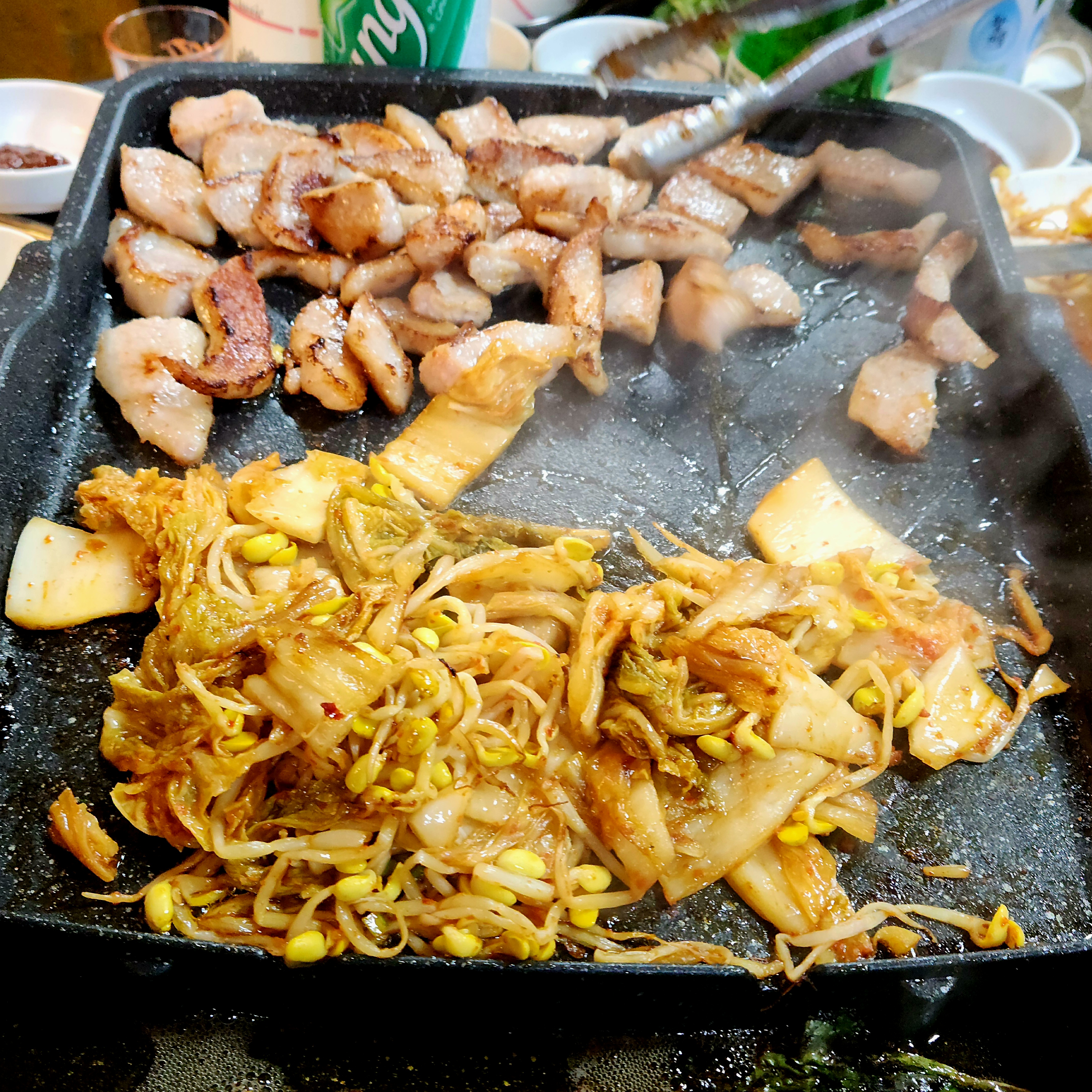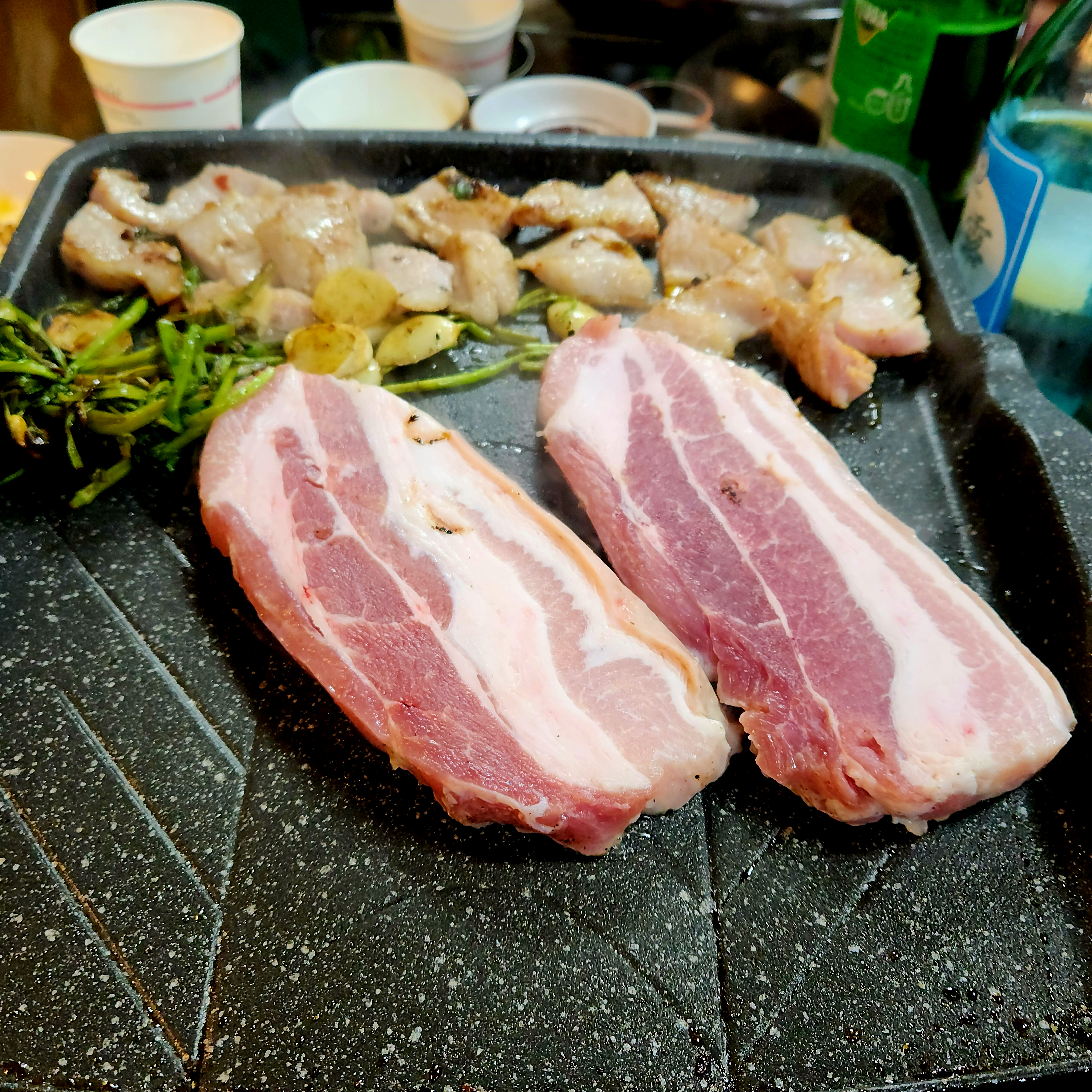 갈매기살 항정살, 삼겹살 시키면 김치와 미나리를 같이 올려주는데 좋았다. 고기는 아마 수입산일 것이다. 구글 점수는 3.7점인데 반해서 네이버는 4.44점이다.(음 대체적으로 네이버가 후한 편으로 보이는데, 진주 대박집은 구글이 많이 박한 점수라 본다.) 개인적으로는 4.4점은 줘도 된다고 본다. 다만 공간이 좀 협소하고, 우리 사장님 내외분이 약간 붙임성이 떨어진다. (추가 주문하면서 김치 좀 더 달라고 하면 눈치를 좀 준다.)