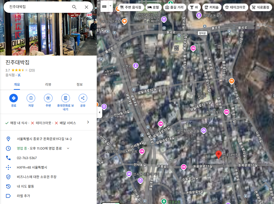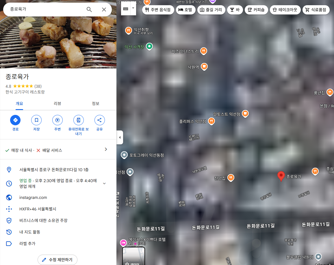 돈을 많이 벌어서 건물을 새로 지은 거 같은데 맛 좋다. 바로 위에 소개한 '진주 대박집'에서 옆에 옆에 위치한 고기집인데. 구글 평점 4.8점, 네이버 별점 4.78점으로 이건 좀 많이 후한 거 같고 4.5점은 줄 수 있다. 종로 쪽에 많이 가본 사람들은 알겠지만 익선동이 고기집촌인데 어딜까나 맛있다. 굳이 유명한데 줄 서서 기다릴 필요는 없고 자리 있는 곳에 들어가면 될 거 같다. 다만 사진이 필요하다? 그럼 기다려야겠지~