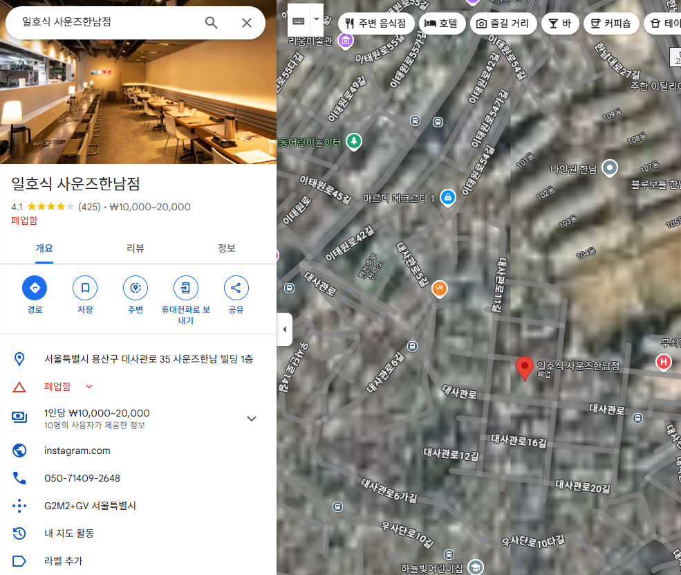 예전에 한남동에서 일할 때 자주 갔던 곳인데 폐업을 했다고 함. 그래도 별점은 살아 있어서 살펴 보면 구글 평점은 4.1점인데, 개인적으로는 3.8점이다. 폐업해서 네이버 별점은 없다. 일식 가정식을 표방하던 곳이라 음식 용기나 플레이팅은 깔끔했는데, 맛이 뛰어나다는 생각은 못해 본 곳이다.