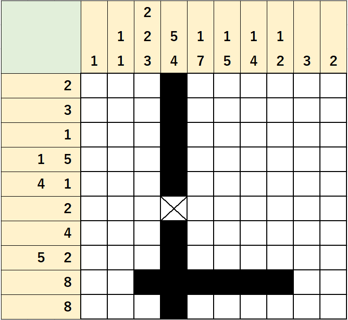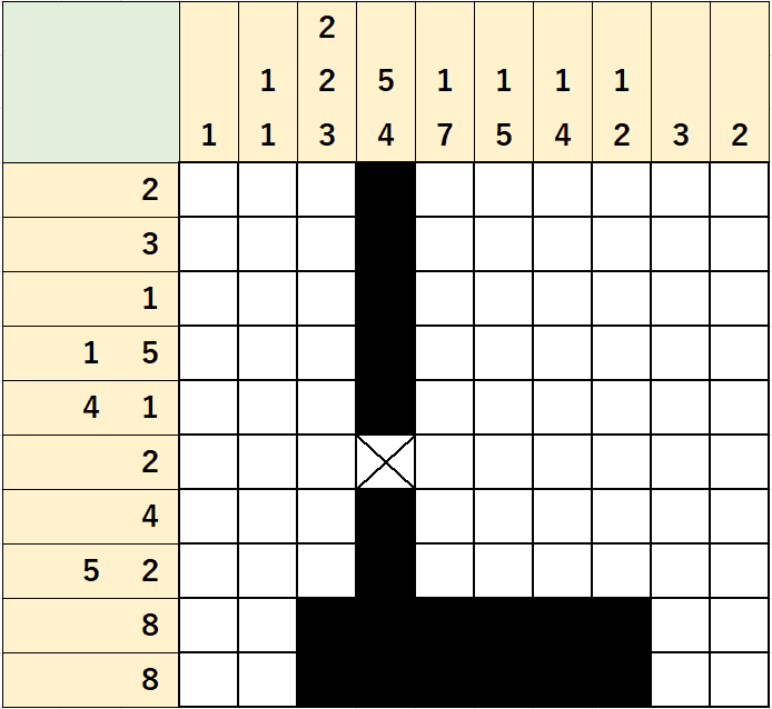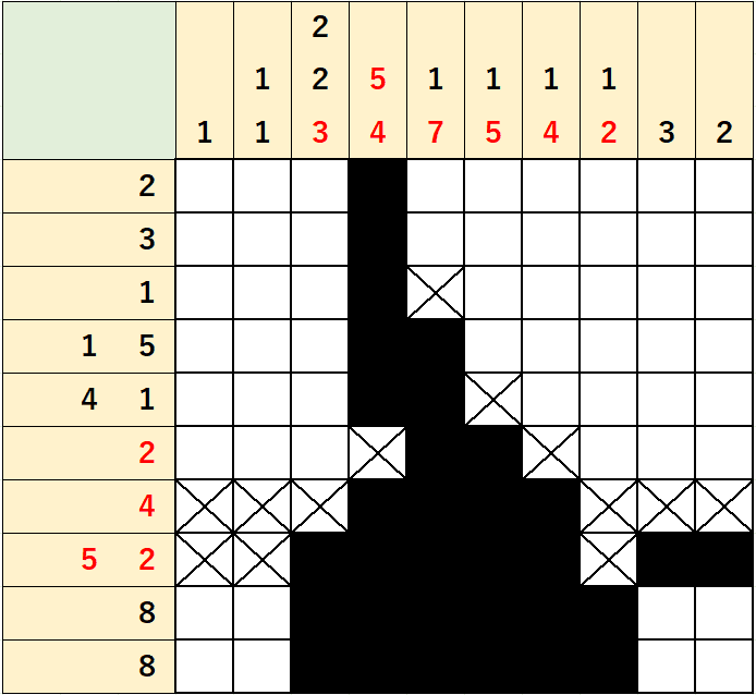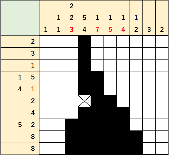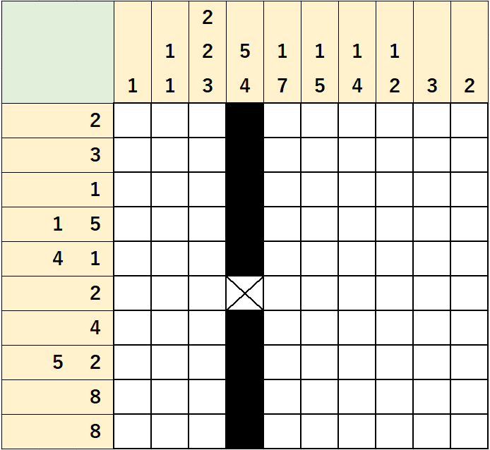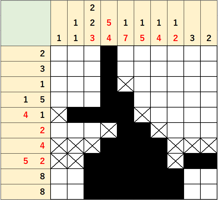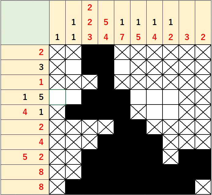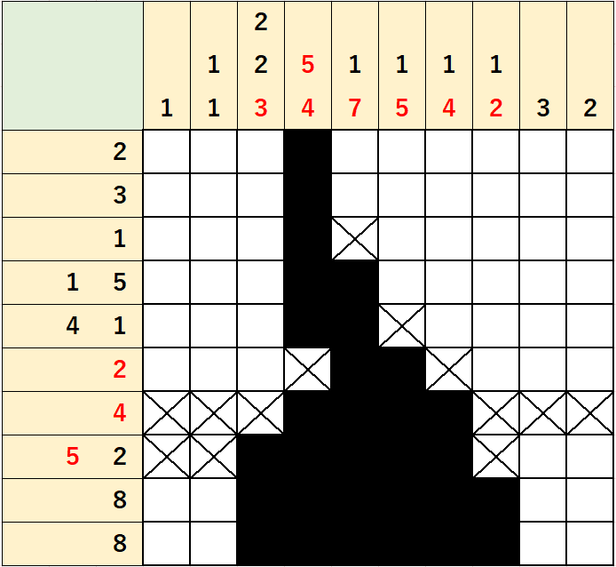 위와 같이 열에 대한 가장자리 숫자 박스' 마킹을 완료하고 X표를 칠하고 나면 부수적으로 행에 대한 숫자가 완성되기도 한다. 바로바로 X표를 추가하자~