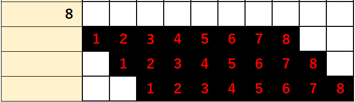 좌측으로 박스 1개가 칠해지는 경우와 우측으로 1개가 칠해지는 경우 2가지가 존재한다. 그래서 그 두 가지의 가능성을 모두 고려해서 박스 + 필요한 숫자만큼 띄운 후 X표시를 칠해 주는 것을 잘 익혀 두자~