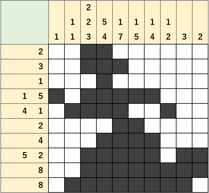 이번 글에서는 실전 #10x10 #노노그램을 풀며 노노그램 #기본규칙에 대해 알아보도록 하겠다. 목표하는 최종 그림은 아래와 같다. 음 글을 쓰다 보니 좀 길어져서 1부와 2부로 나누도록 하겠다. (사실 처음 배울 때가 어렵지 익히고 나면 규칙 자체는 매우 단순하다. 어려워 질수록 찾기가 힘들고 마킹을 실수할 가능성이 높아져서 난이도 차이가 나게 된다. 물론 작정하고 어렵게 낸 문제는 귀류법까지 써야할 수도 있다~)