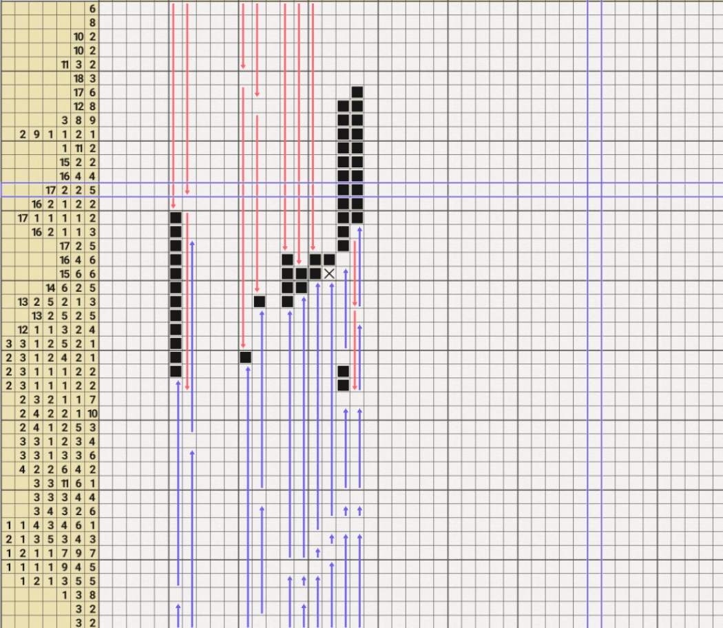 숫자를 따라 노노그램을 풀다 보면 후반부에 막혀서 포기하는 경우가 가끔 있을 것이다. 숫자로만 노노그램이 풀리지 않을 때는 참이라는 가정하에 모순을 찾아내어 참이라고 가정한 부분에 X