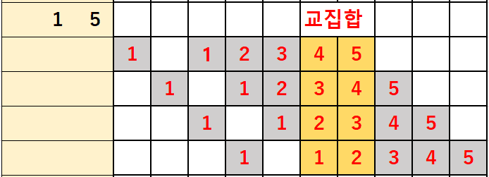 그 중에서 2,3번 행을 제외한 최좌측에서 시작하는 카운트와 최우측에서 시작하는 카운트가 취하게 되는 교집합 부위는 4가지 경우의 수 어떠한 상황에서도 불변하는 것을 알 수 있다. 위의 움짤을 좀 더 단순화시켜봤다.