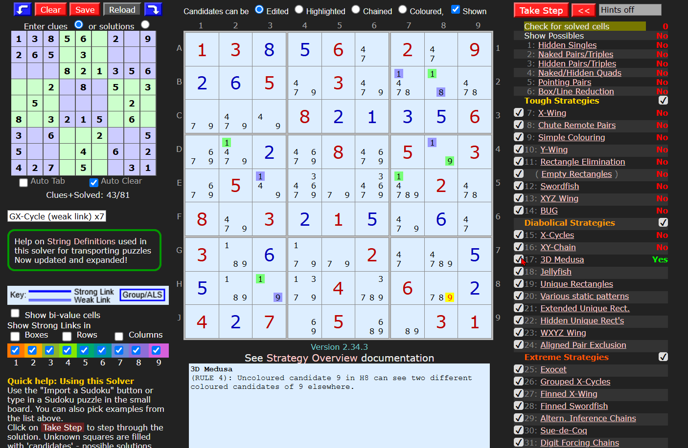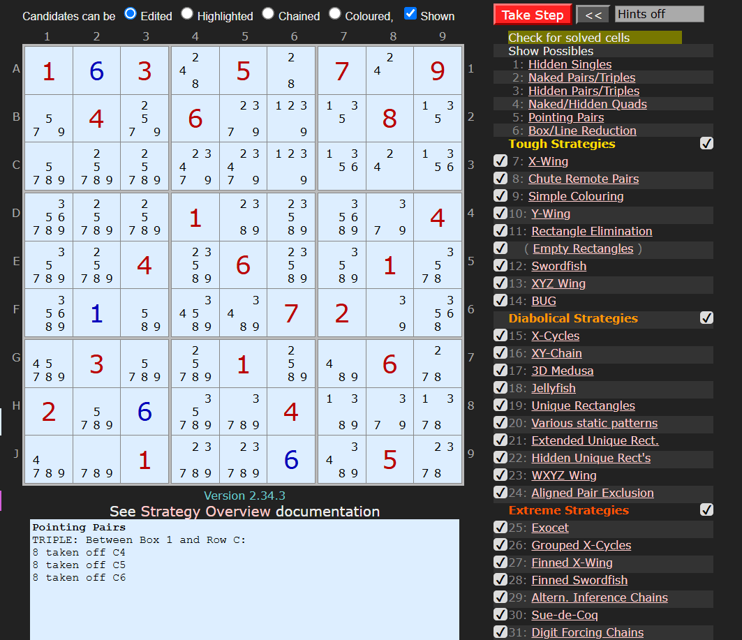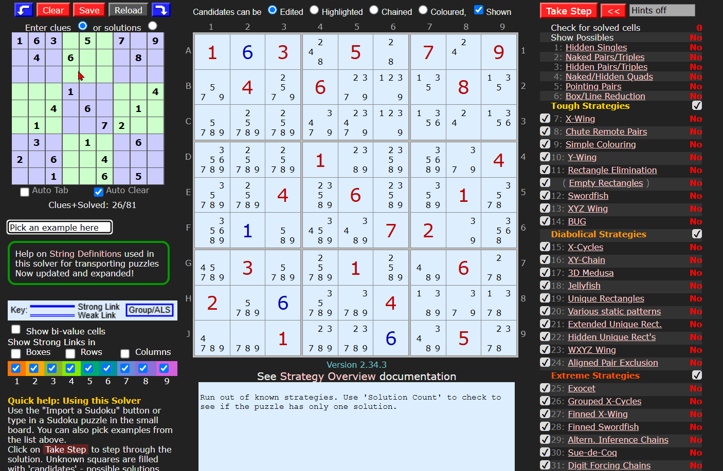 take step'을 3번 누르면 솔루션이 나오고 4번 누르면 공식이 적용되어 지워지는 후보수 또는 확정된 숫자의 결과가 나타난다. 또한 인터페이스 소개에서 설명을 하지 않았는데 게임 밑에 보면 See Strategy Overview documentation이라고 써 있는데, 적용된 공식을 글로 풀어준다.