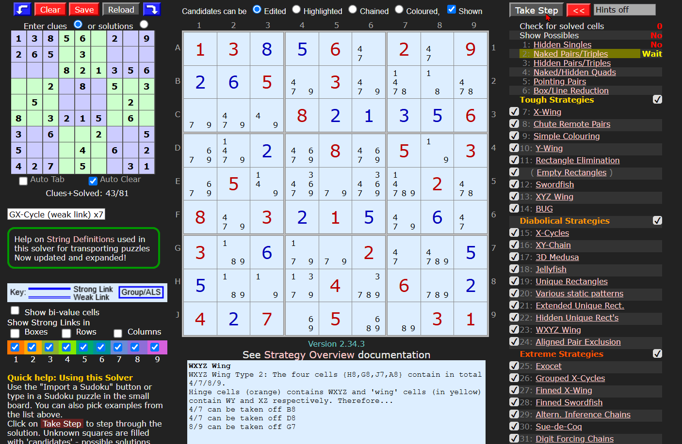 그리고 숫자별로만 체크해서 볼수도 있고 일부분 또는 전체를 체크해서 볼 수 있다. 위의 움짤이 직관적이라 잘 알 것이다. XY윙 등의 중급 공식을 넘어 체인공식으로 가는 인원은 스트롱 링크 상황을 위의 스도쿠 위키 기능으로 자주 보면 매우 큰 도움이 될 것이라 믿는다.