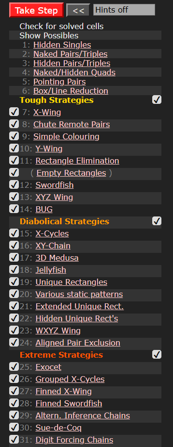 스도쿠의 모든 공식의 풀이법이 제공된다고 보면 되겠다. (아래 더 보기에 적용되는 공식을 표로.)