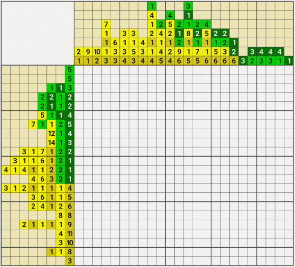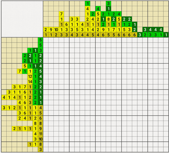 지난 시간에 이어 컬러 노노그램을 좀 더 효율적으로 푸는 방법에 대해 알아 보도록 하겠다. 보통은 매칭되는 컬러를 찾는 것이 메인인데... 우선 아래의 짤을 보자! 위의 짤을 보면 더해서 제일
