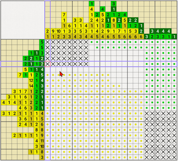 아마 나 같이 흑백 노노그램에 푹 빠졌다가... 컬러 노노그램의 맛을 알고 푸~ 노며든 인원들이 많을 것이다. 그리고 대부분은 아래 움짤처럼 초반 공략을 할 것이다. 위에서 아래로 스캔하면서