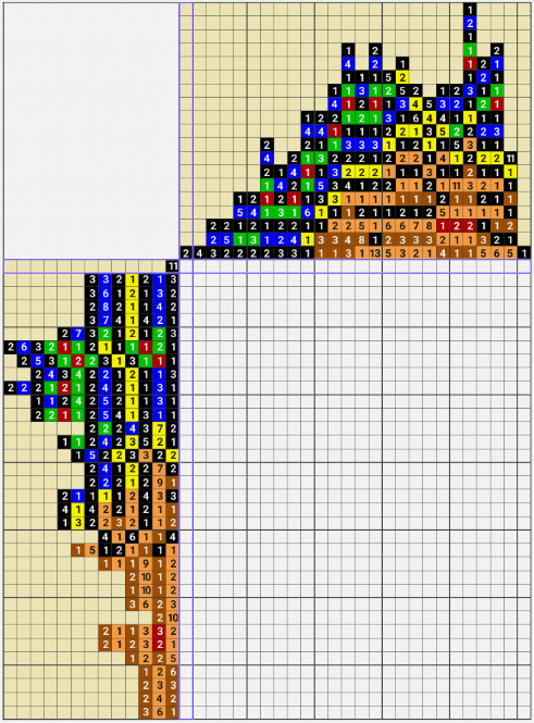 지난 시간에 이어 컬러 노노그램을 좀 더 효율적으로 푸는 방법에 대해 알아 보도록 하겠다. 보통은 매칭되는 컬러를 찾는 것이 메인인데... 우선 아래의 짤을 보자! 위의 짤을 보면 더해서 제일