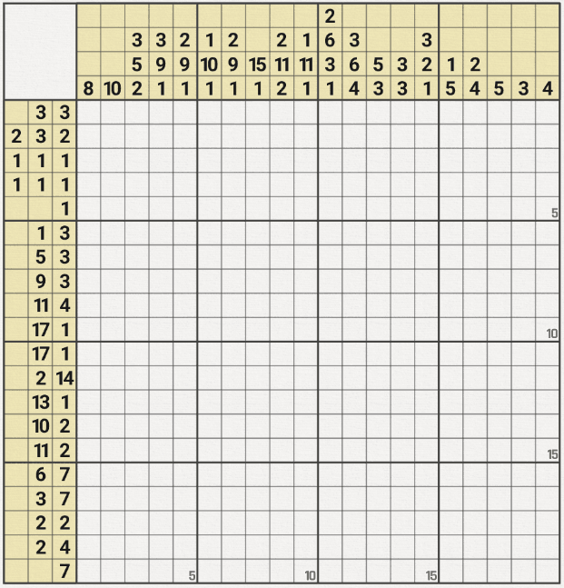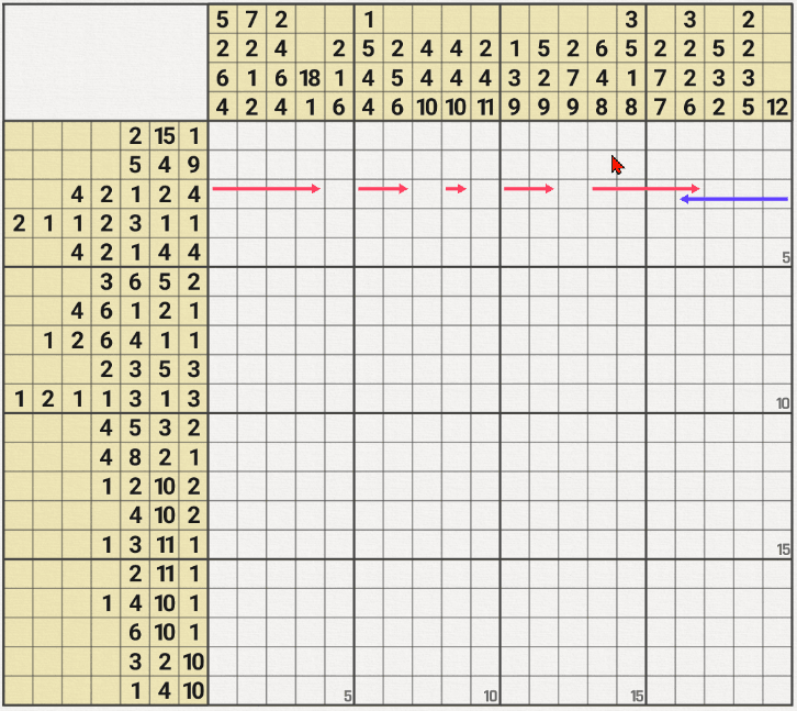 이렇게 1차 보조선 마지막 숫자의 확정되지 않는 남는 칸수에 주목하면 좀 더 편안하게 노노그램을 즐길 수 있다.